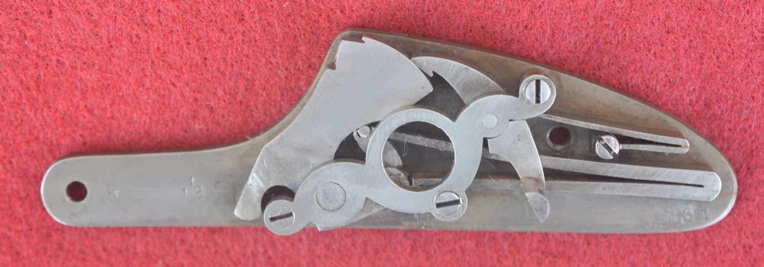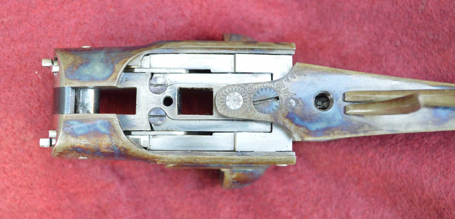 No. 48692 is built on a modified A&D boxlock action. In the top picture, the bottom plate is removed to reveal the core elements of the lock.