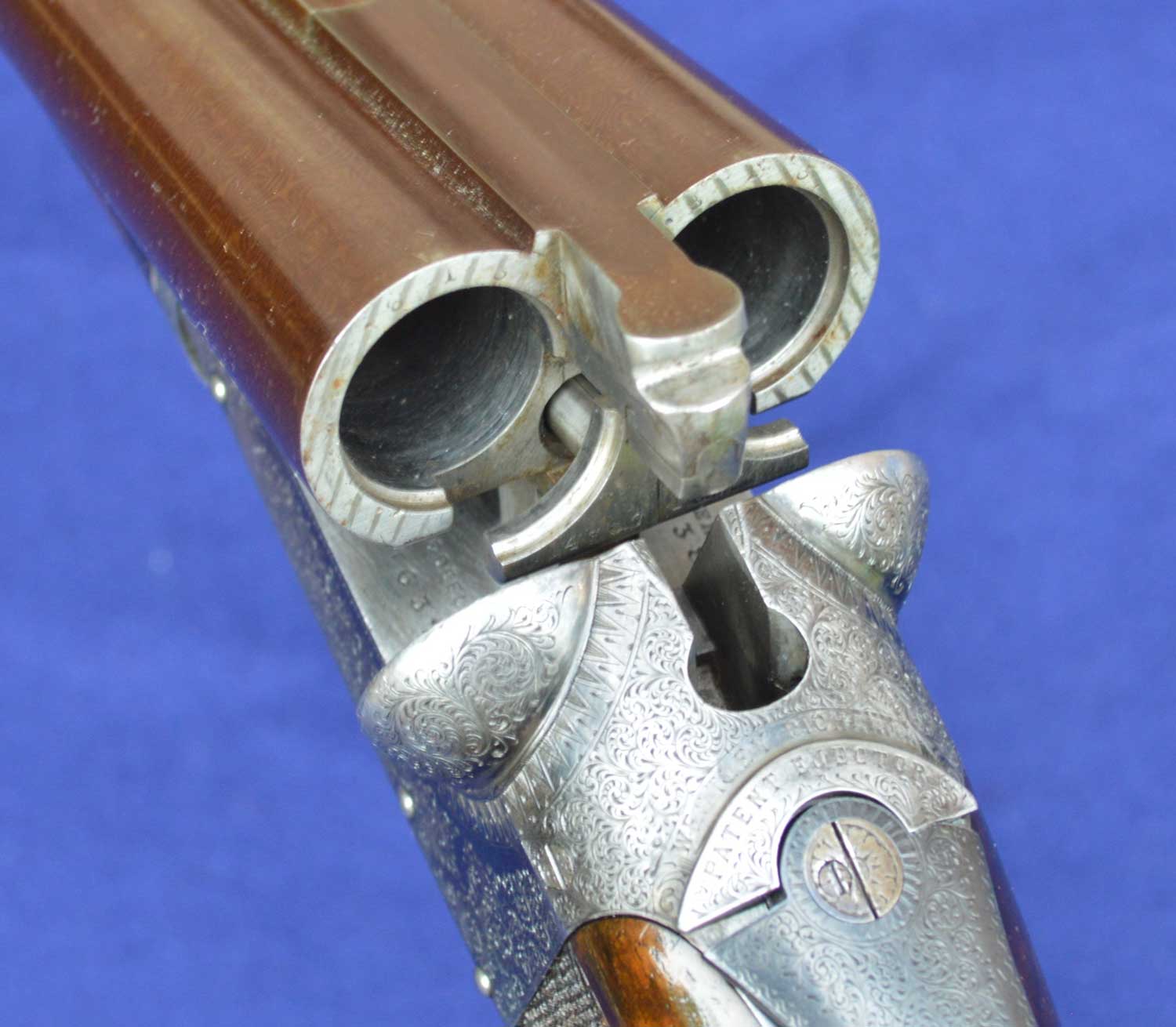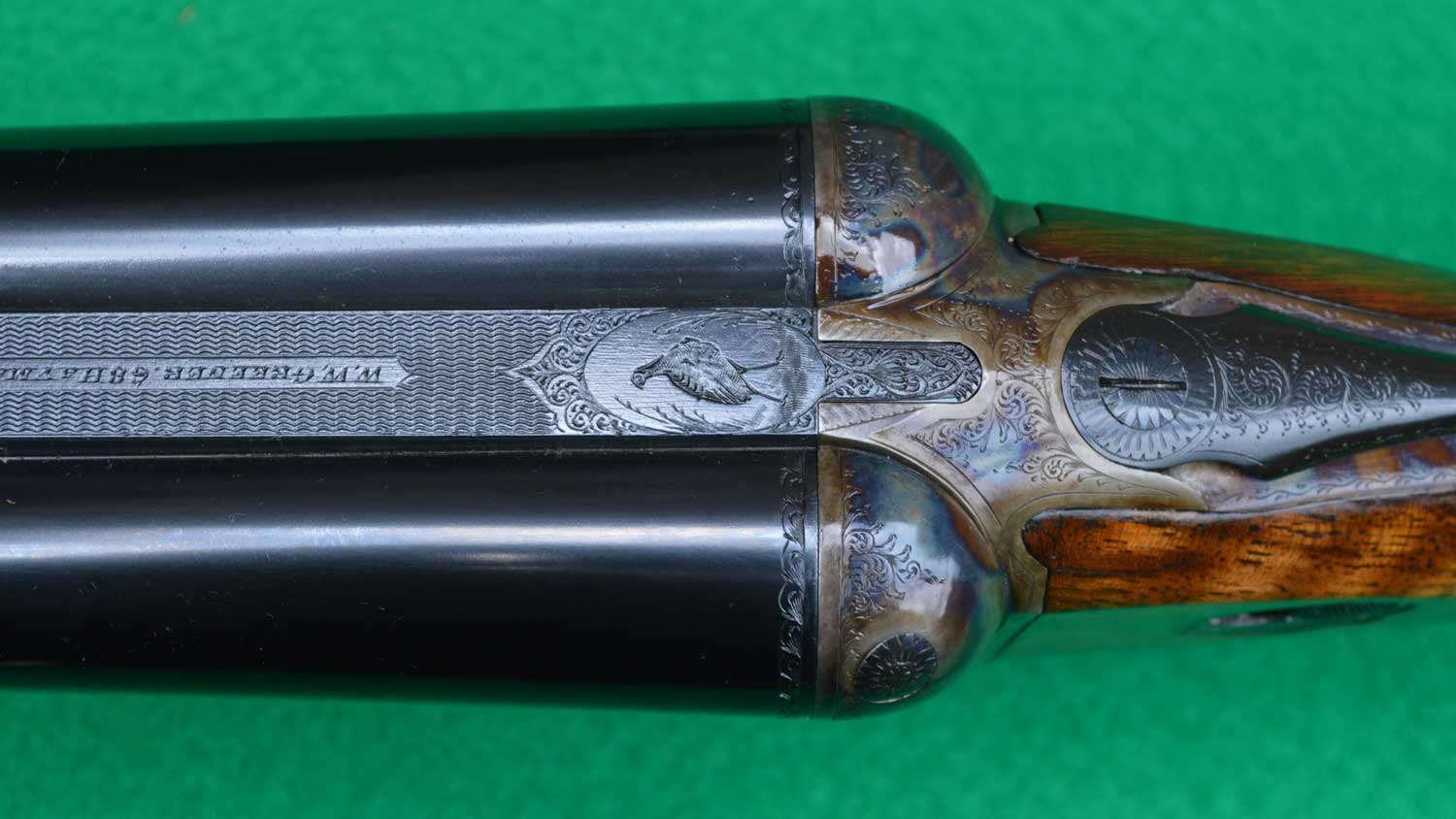 The gun has a “pigeon rib.” The term is defined as a top rib that is flat, straight, raised and matted or otherwise surfaced to reduce glare. The beautifully engraved English blue rock pigeon on the top rib was not primarily intended to reduce glare or for easy identification. Rather, as stated in Greener advertisements, it was engraved on the rib as “a sign that the gun has been bored specifically for this class of shooting.”