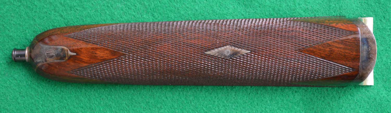 The length of pull is 14 inches to the end of wood, the drop at comb is 1 3/8 inches and the drop at heel is 2 inches. The cast is 1/8-inch off. The stock is fitted with a 1-inch leather recoil pad. The modified pistol grip was very popular on live pigeon guns, as it allowed the gun to be held more securely than the straight grip.