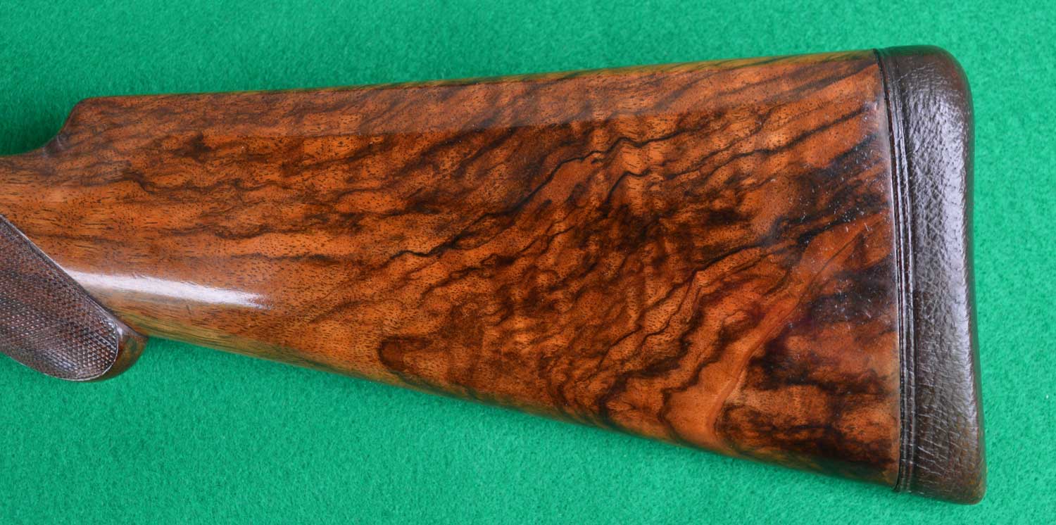 The stock is made of highly figured French walnut that would have been seasoned for between eight and ten years. The grain alignment is perfect. The effect of the dark grain against a highlighted multi-tonal background is visually stunning. The figure, color and contrast are similar on both sides, which is rare. The checkering is 28-point. This stock rates a 4+.