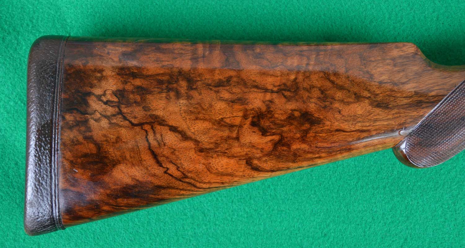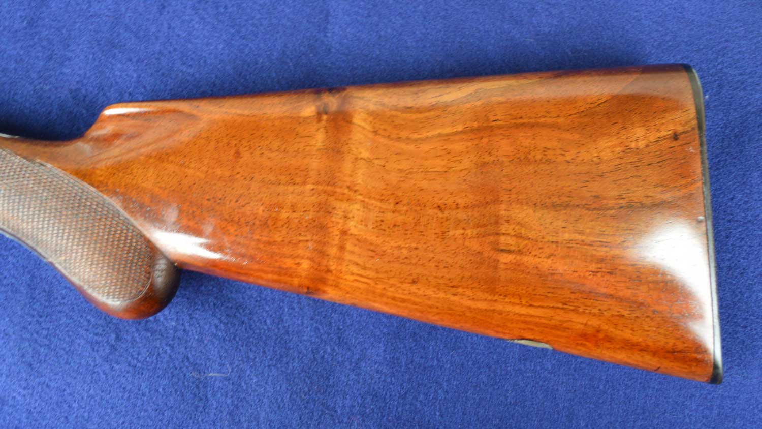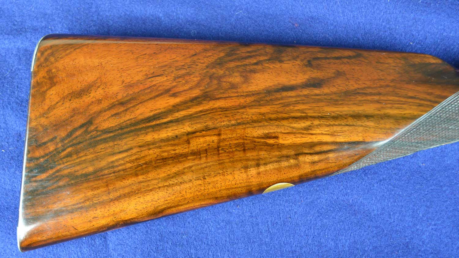 The stock is made of English walnut and has as a traditional straight grip. Given the shooting style at the time, this type of grip was thought to allow the shooter to engage the second trigger more smoothly and quickly. The downside of stocks with pistol grips is that the wrists tend to be longer, narrower and, hence, potentially weaker. Long tangs and trigger guards serve to reinforce the wood. Nevertheless, the strength of a stock primarily comes from grain alignment, assuming the stock blank is dense and properly seasoned. On this gun, the dark, curved grain flows from the body of the stock through the wrist and into the stock head. Because the left side is a bit less well aligned, this stock rates a 3+.