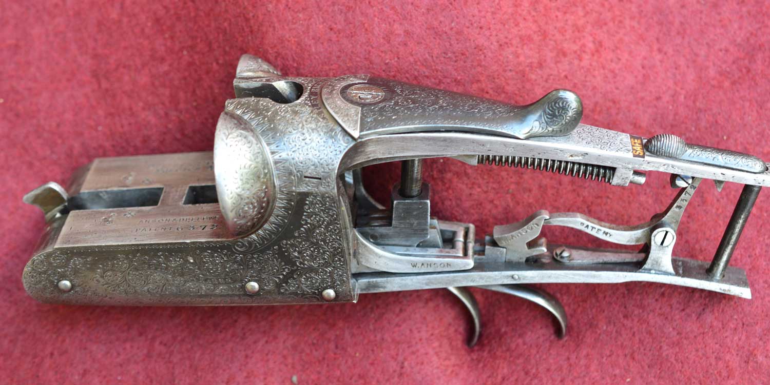 The Westley Richards 12-bore hammerless ejector gun No. 14367 shown here is a highest quality (A) gun. It was manufactured in 1887 and is built on an 1883 patent-improved A&D action pictured below. [The Sauer and Greener guns described earlier in this article use “modified” A&D actions. The A&D action on No. 14367 is the original design.]