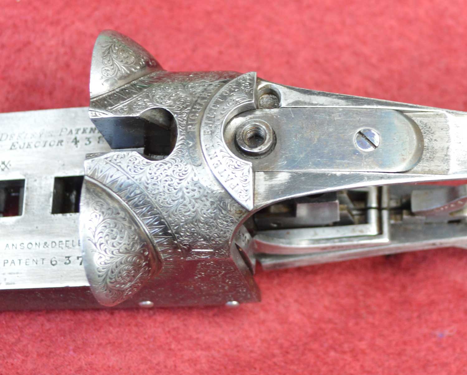 This gun uses an 1896 Greener-patented trigger mechanism. Each of the two independent sears has an automatic intercepting safety-catch to prevent the gun from discharging if a sear is jarred or released in any way other than pulling the trigger. The receiver itself is 1 5/8 inches wide, 2 1/4 inches tall and 3 1/4 inches long without the tang. Together, the receiver, action and trigger mechanism weigh 1 pound, 12 ounces.