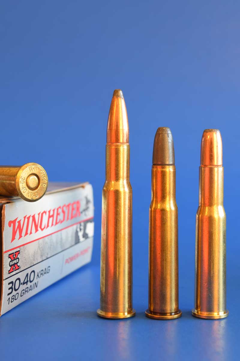 Krag rifles fired the 30-40 (left). The 30 W.C.F. (center) followed the 303 Savage in the Savage 1899.