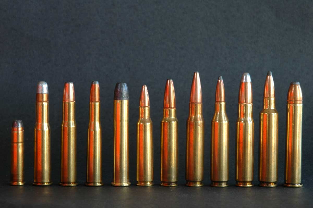 Cartridges for Savage lever-actions, in chronological order, L-R: 32-20 (prototype rifle), 303 Sav., 30 W.C.F. (30-30), 25-35, 38-55, 250 Sav., 300 Sav.; 308, .243, 358, 284 and 375 Win. Not shown: the 32-40 (dropped in 1919), 22 Hi-Power (dropped in 1941) and 22-250 (99-C only, from 1977).