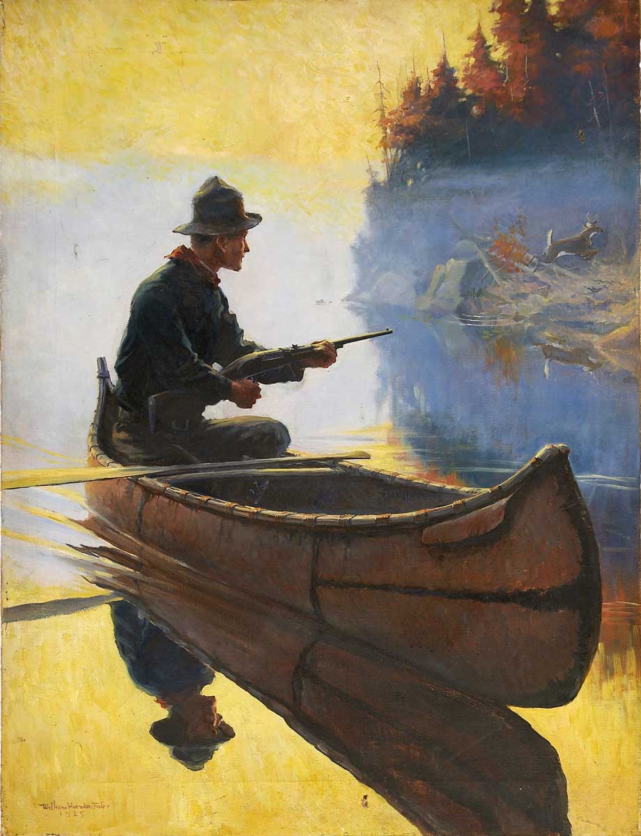 William Harnden Foster’s illustration for National Sportsman depicted a hunter raising his Model 1899 Savage rifle. Only One Shot (1925). Oil on canvas, 20 x 26 inches.