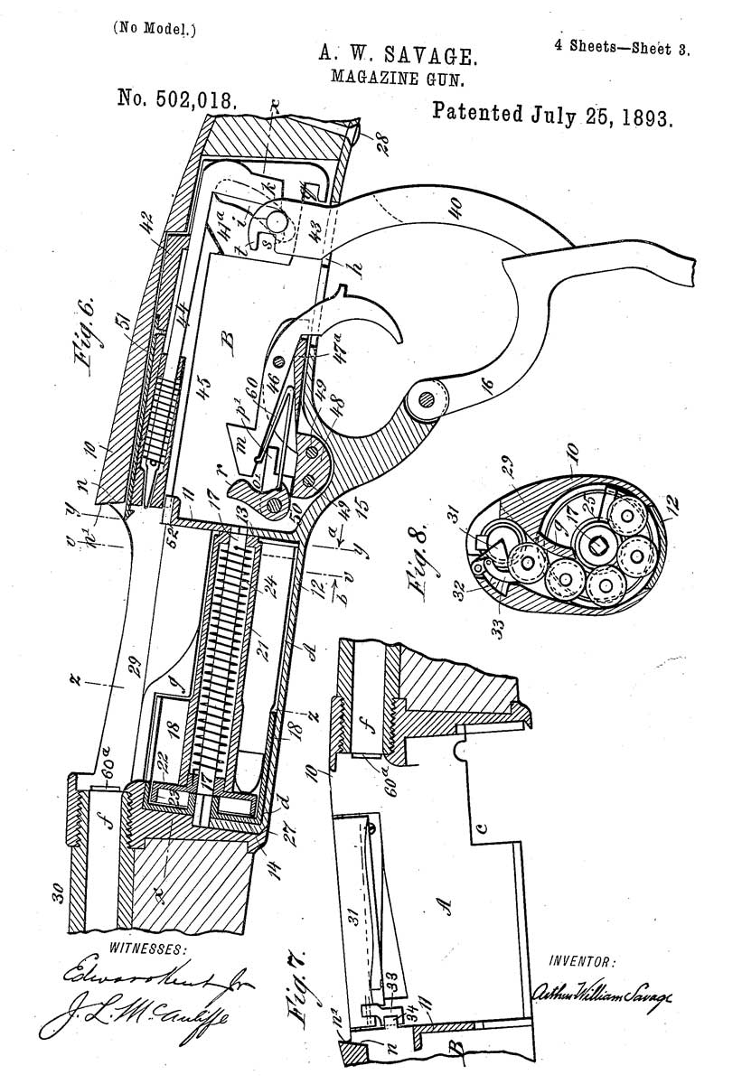 Savage’s magazine gun patent #502018 applied for on April 10, 1889 and granted on July 25, 1893.
