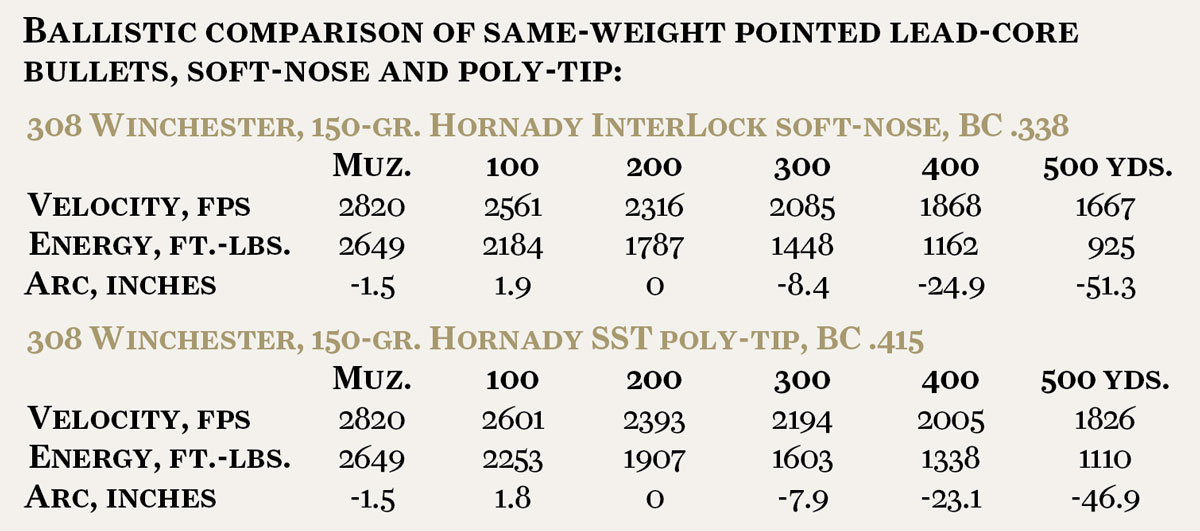 Long pointed bullets with gradual ogives (Pinocchio noses) have high ballistic coefficients. These numbers tell how well bullets fight drag. Every BC benefits from high sectional density (ratio of a bullet’s weight in pounds to the square of its diameter in inches). A pointed nose slips through air better than does a blunt nose. But a long pointed bullet adds weight without adding frontal resistance, so is more efficient than a stubby one. BCs of modern bullets are listed as G1 and G7. The G1 “standard bullet” dates back a century and is not very sleek so, in comparisons, bullets have higher G1 numbers than when matched to a sleeker G7 standard.