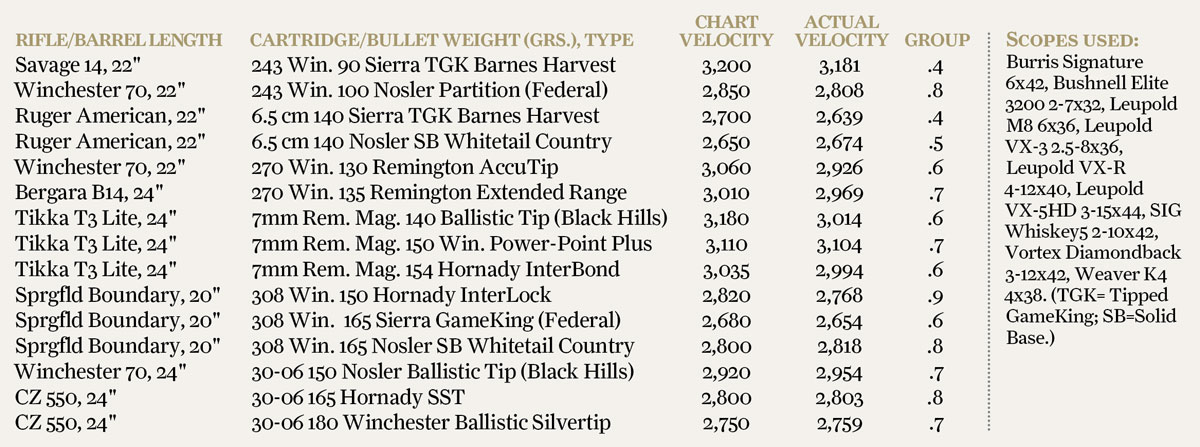 In my youth, Winchester, Remington and Federal didn’t tell you what to shoot with their ammo. Hunters grew up matching loads to game, or just using what came to hand. The ammunition business is now intensely competitive; for a given cartridge there may be more loads from a single manufacturer than there were industry-wide short years ago! Cartridge boxes now wear alluring images of antlers, and labels that, like automobile monikers, buttonhole customers: Hornady’s American Whitetail, Winchester’s Deer Season and the new Barnes Harvest Collection and Nosler Whitetail Country. These loads are modestly priced and well finished. My range trials have showed they—and other “ordinary” deer loads—are more than peppy and accurate enough to match, or even trump, costlier options. Mostly I used rifles and scopes common in deer camps to check velocities (in fps, with a Garmin Xero C1 Pro chronograph) and record the best 3-shot, 100-yard group in inches.