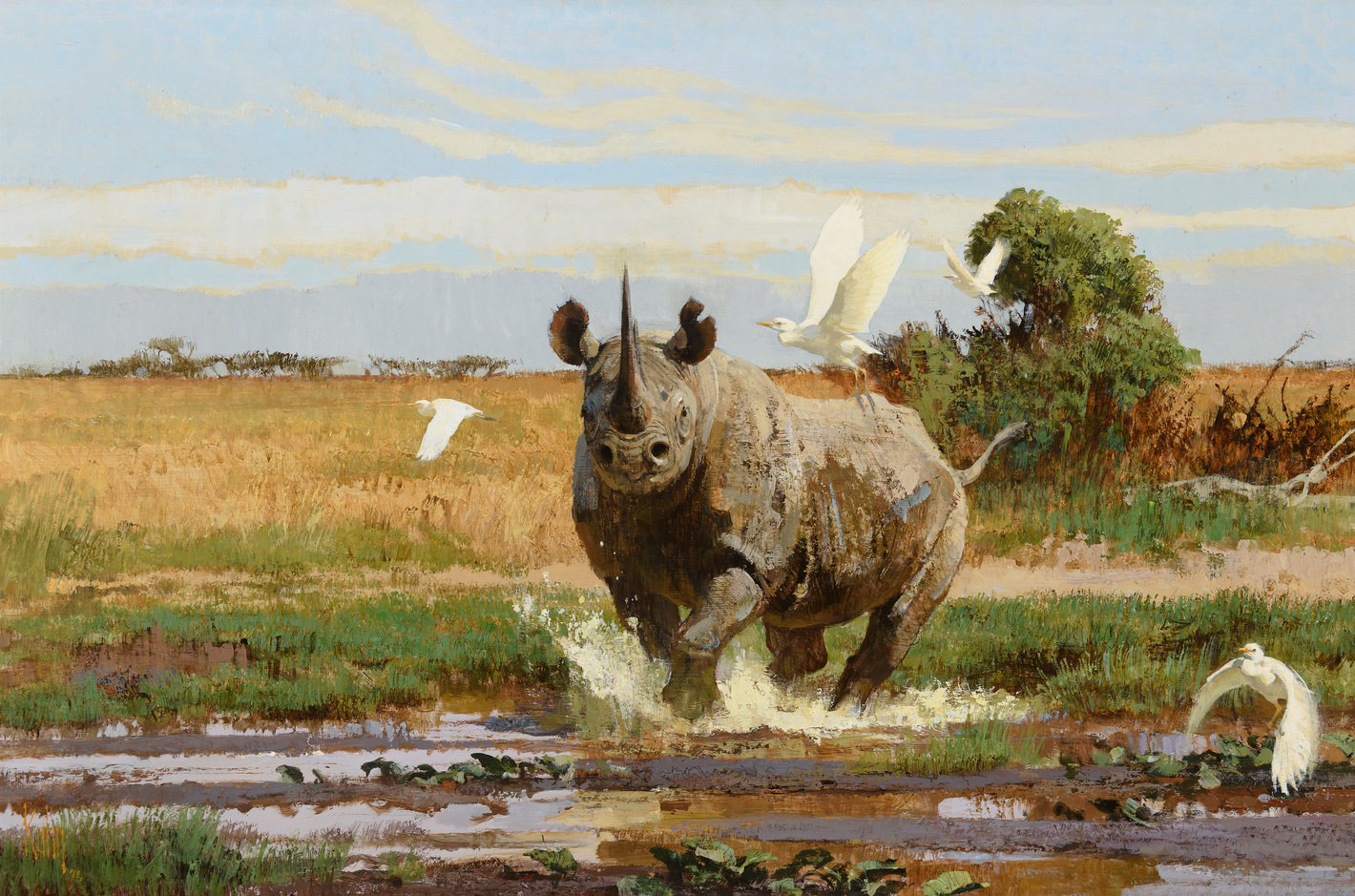 Bob Kuhn (1920 – 2007), Rhino and Cattle Egrets (1973), acrylic on board, 24 × 36 inches.