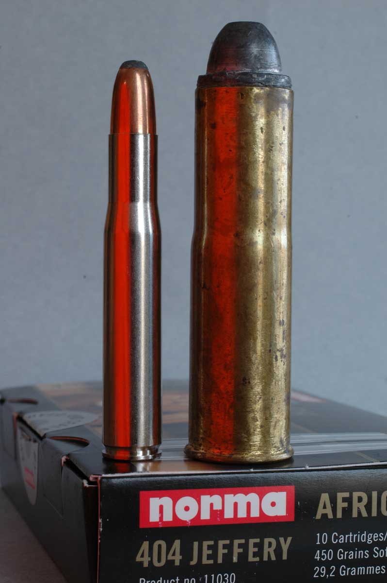 A popular “elephant gun” early on was a 4-bore muzzleloader (550 grains of blackpowder, a 4-ounce ball). Right: a 4-bore cartridge, next to a current 404 Jeffery, from which modern “beltless magnums” evolved.