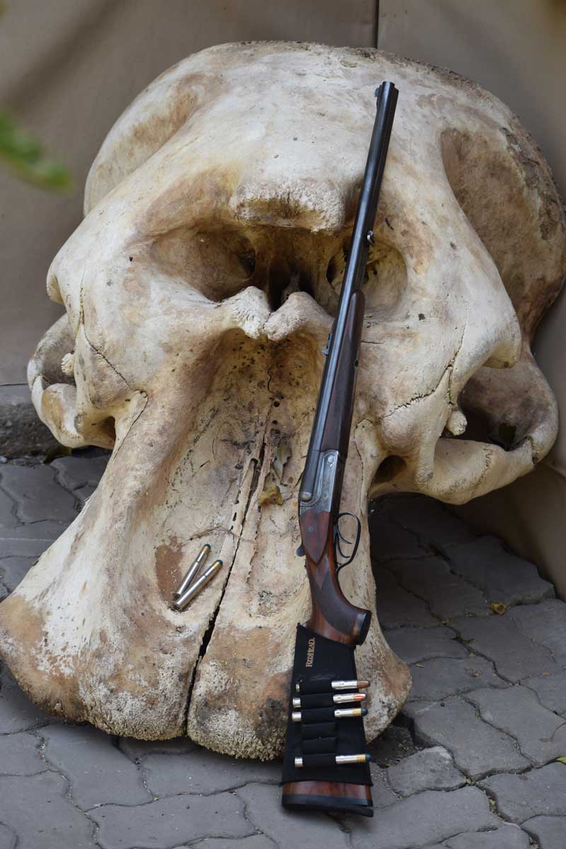 The elephant skull behind this 470 Nitro Express double rifle shows the mass and complex bone structure that could cause hunters to bungle a brain shot. Bell studied and made anatomical drawings of elephants.
