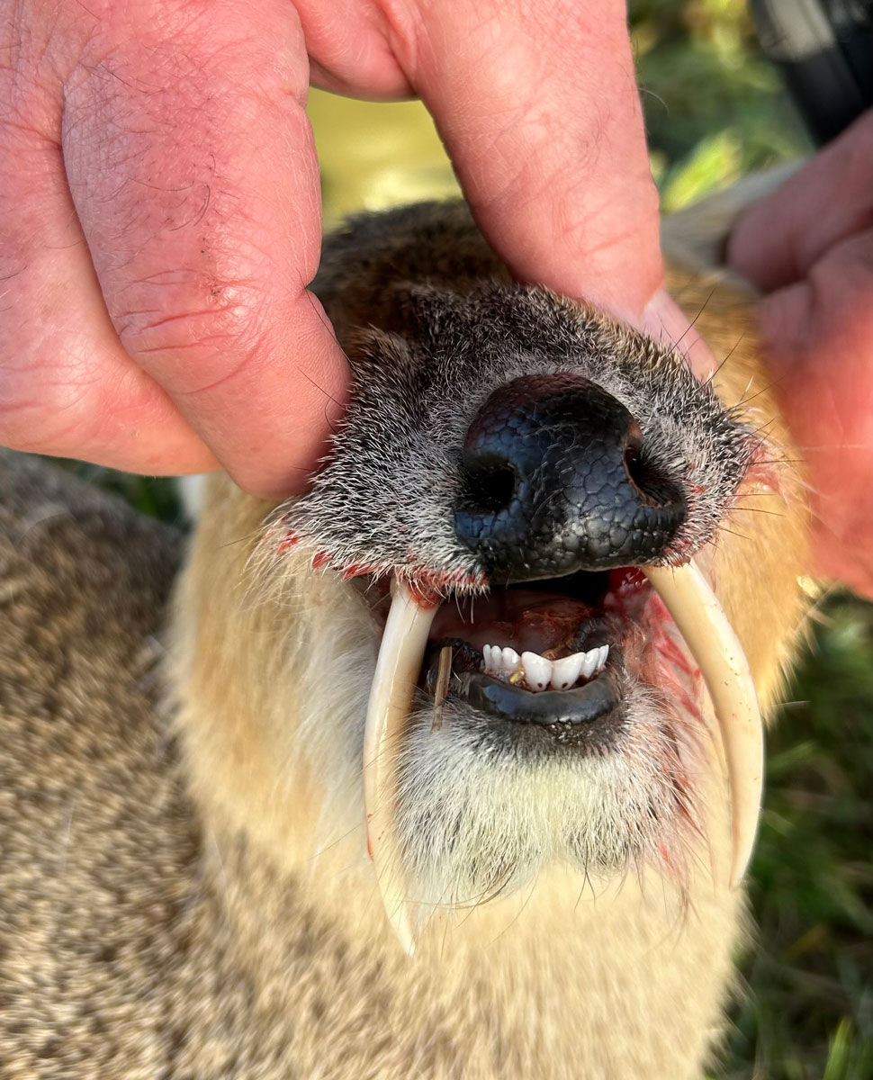 At my buck’s side, I marveled at his long, pointed and sharp fangs. A prayer of thanks, then several photos. A dream of 40-plus years had finally been realized! A little while later, we photographed the three bucks taken that afternoon.