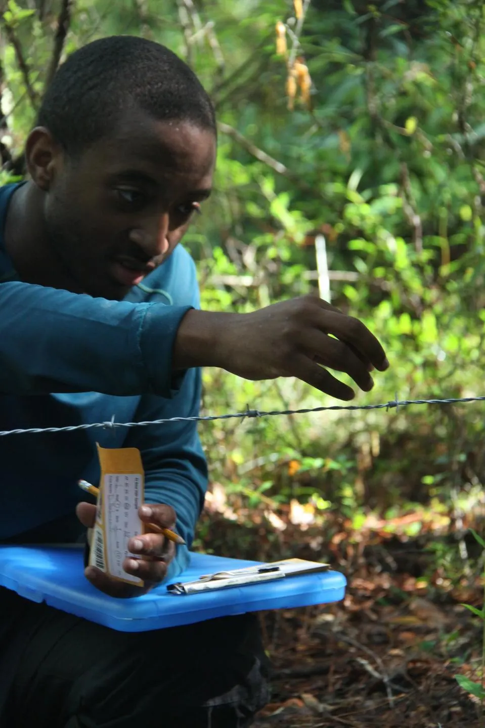 A FWC researcher collects black bear hair to conduct DNA studies.