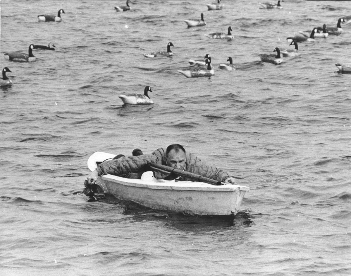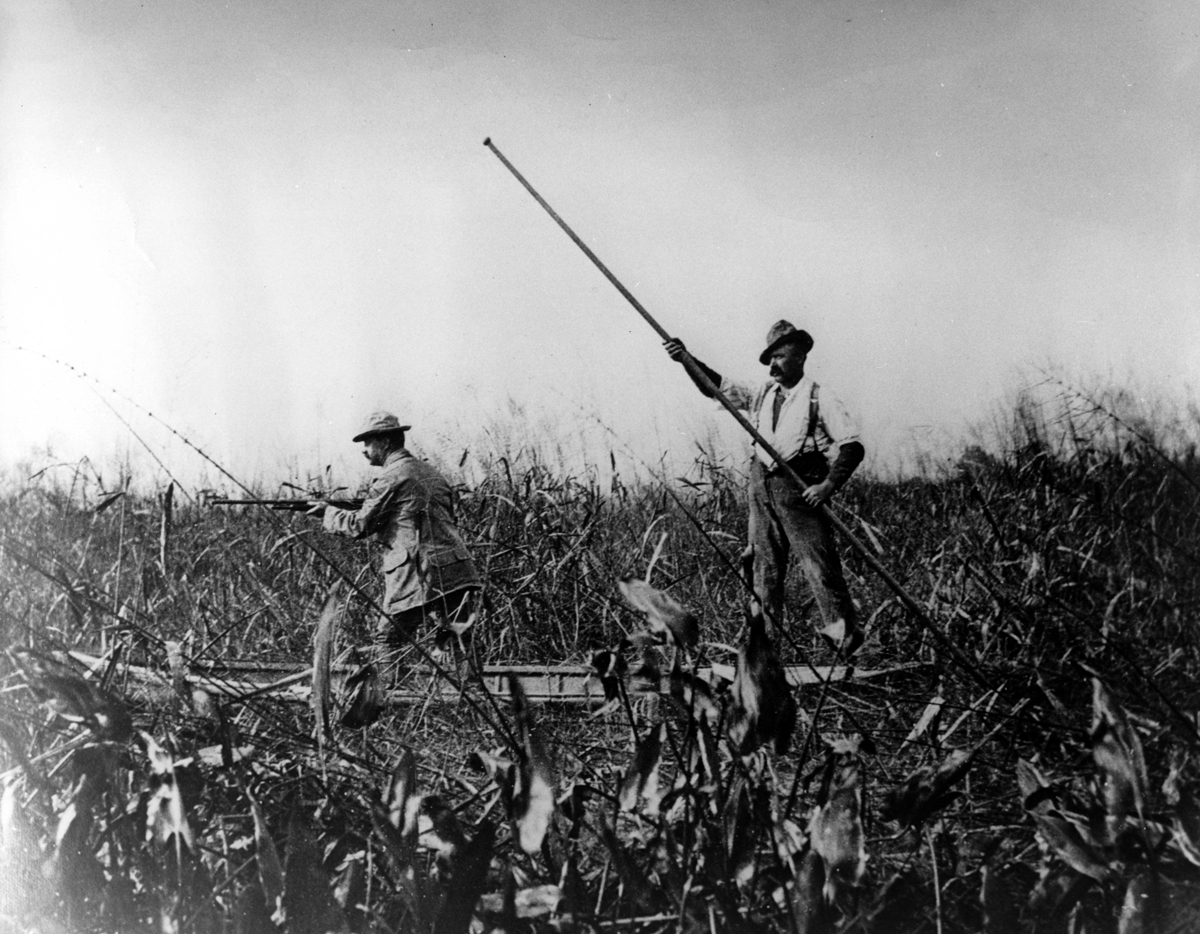 Capt. Joseph Heisler pushes a railbird skiff for sportsman Otto Eisenlohr, circa 1909. Gift of Nelson H. McCall, Chesapeake Bay Maritime Museum.
