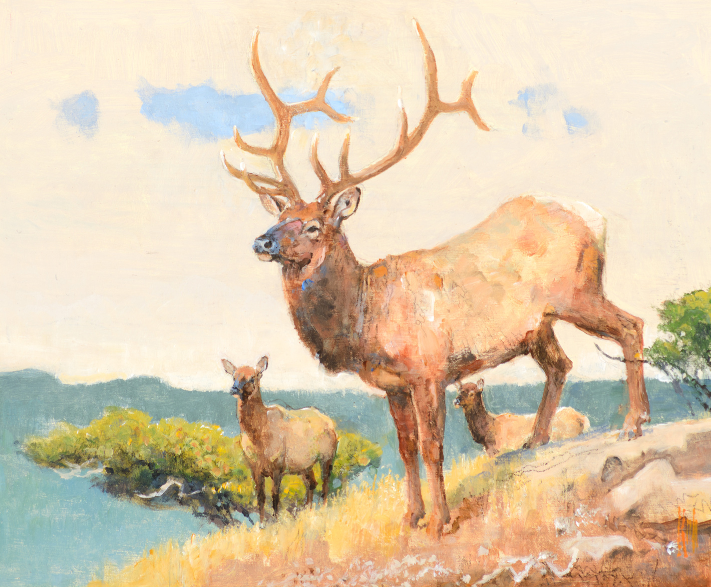 Bob Kuhn, Elk Topping Out, acrylic on board 10 × 12 inches.