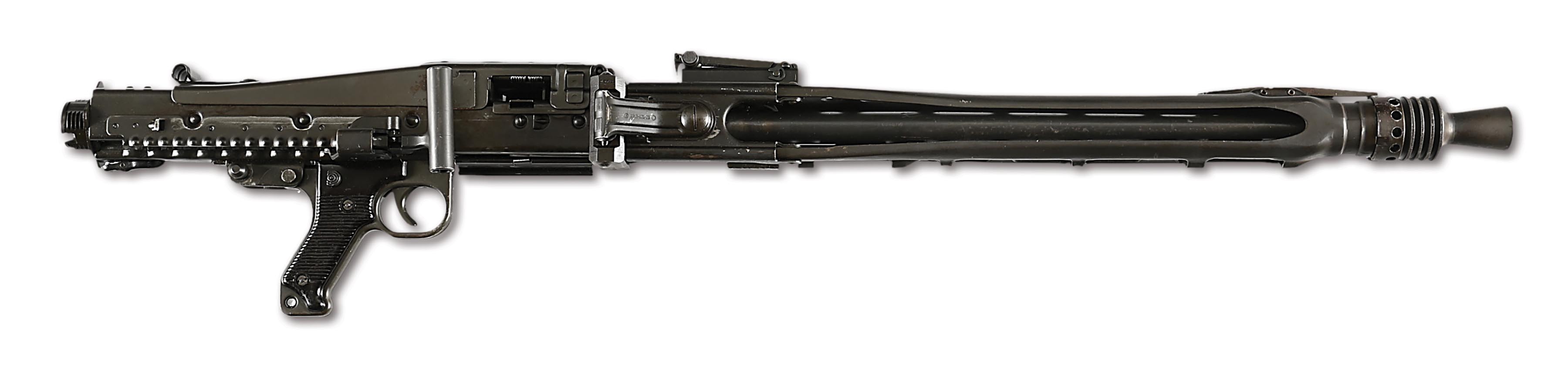The second NFA lot of special note was a very early German Model MG42/59 machine gun imported and registered by Cadillac Gage (Warren, Mich.) and used to bore-sight vehicle turrets. It had a scarce configuration with a 20-inch barrel and factory-correct 7.62x51mm (.308) NATO caliber/bore using M13 disintegrating links. Significantly, it was marked with a very low serial number: 61-00001. Also, at the left side of the receiver, forward of the factory markings, it was marked RHEINMETAL GmbH/FRG CADILLAC GAGE WARREN, MICH in electro-pencil. The absolute first of the MG42/59s, it sold just above its high estimate, for $80,400.