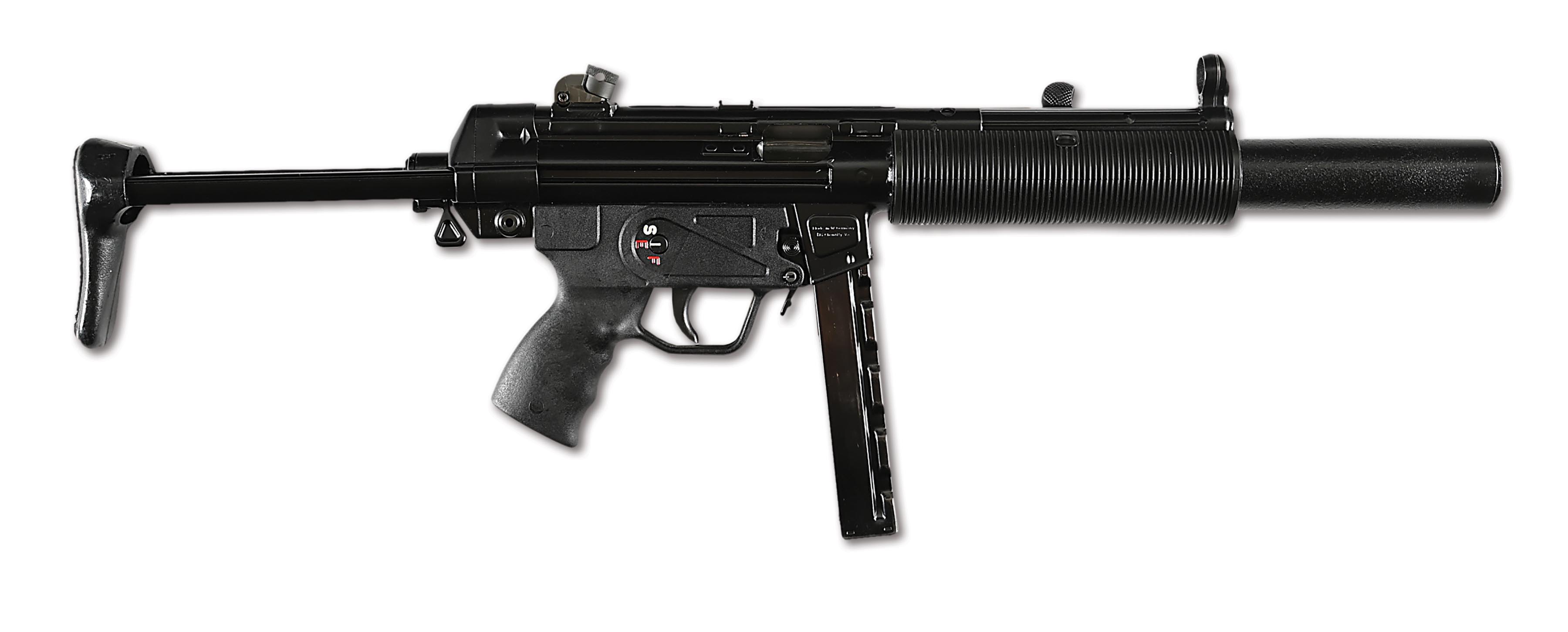 Two extremely fine NFA lots in the December auction earned top-10 status. A factory-original 3-position “S E F” selector Heckler & Koch MP5SD3 registered-receiver 9mm Luger machine gun bore an “IE” proof code on the top of its receiver, confirming it was manufactured in 1984. It was marked Made in W Germany / HK Chantilly, Va on the right side of the magazine well, and HK MP5 SD on top of the receiver. Fitted with a telescoping stock and an immediately recognizable screw-on factory silencer, it also retained its original fixed shoulder stock, four original straight MP5 HK-marked magazines dated 11/67, one ID-marked 20-round magazine, a green three-cell magazine pouch, and an original H&K sight adjustment tool. It sold above its high estimate, for $84,000.