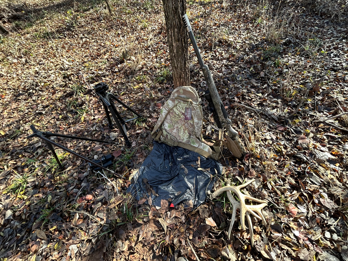 My set-up rattling horns, rifle tripod, camera and podcast, 7mm PRC rifle, trash bag to sit on because of wet ground, and my back pack to make sitting against a tree easier.