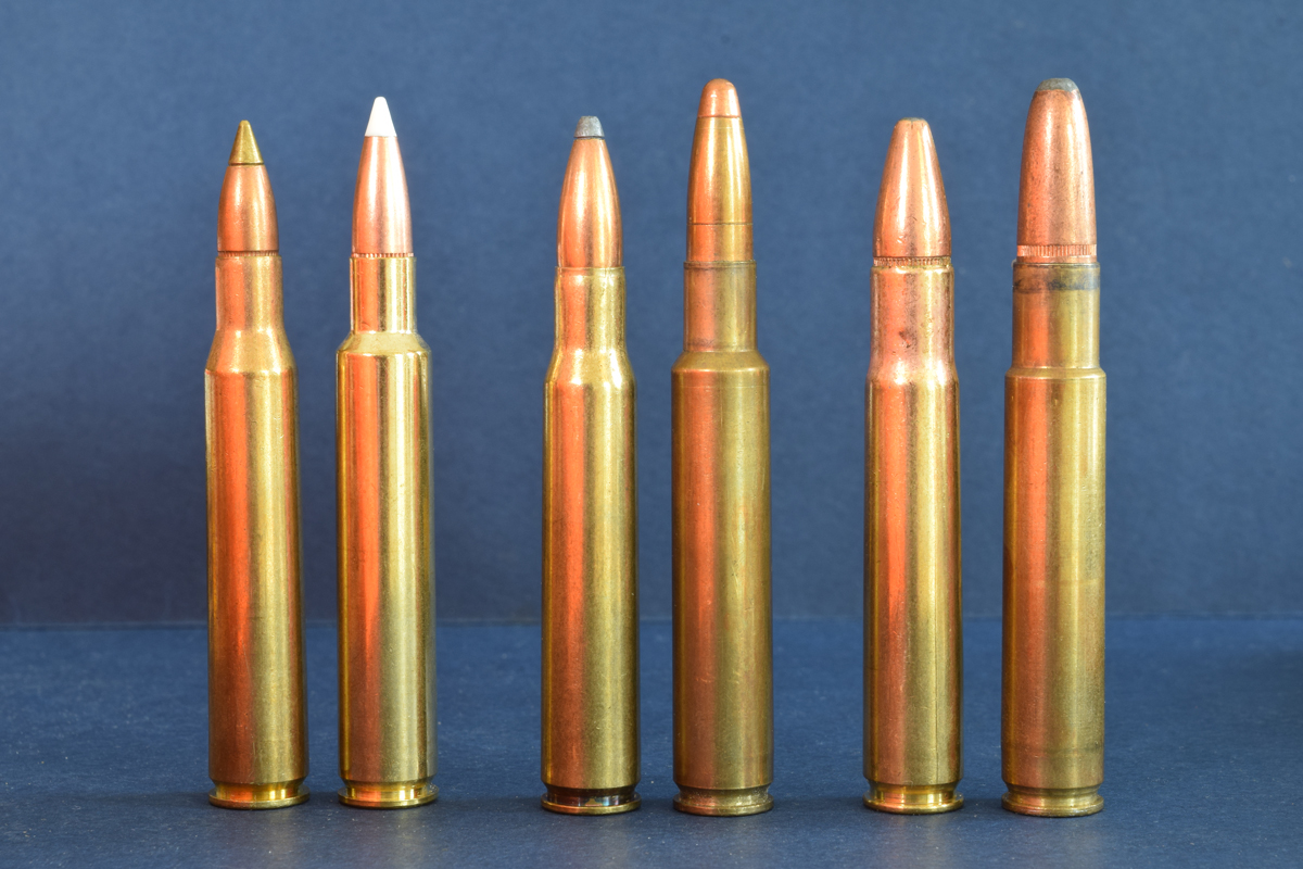 Ackley gave popular rifle cartridges more capacity by reducing body taper and giving the shoulders a steeper angle. From left, standard and Ackley Improved: 280 Rem., 30-06 and 35 Whelen.