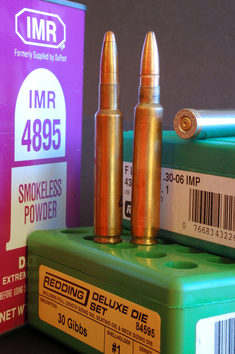 The 30-06 Improved (left) headspaces the same as its parent, the 30-06. The 30 Gibbs (right) requires more work in case-forming to move the shoulder (and headspace datum line) forward.