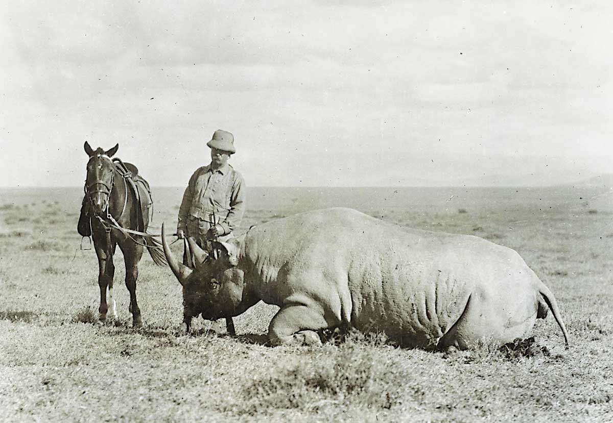 Theodore Roosevelt with rhino, one of Kermit Roosevelt photographs of the African safari, 1909-1910. Courtesy Harvard library, Theodore Roosevelt Collection.