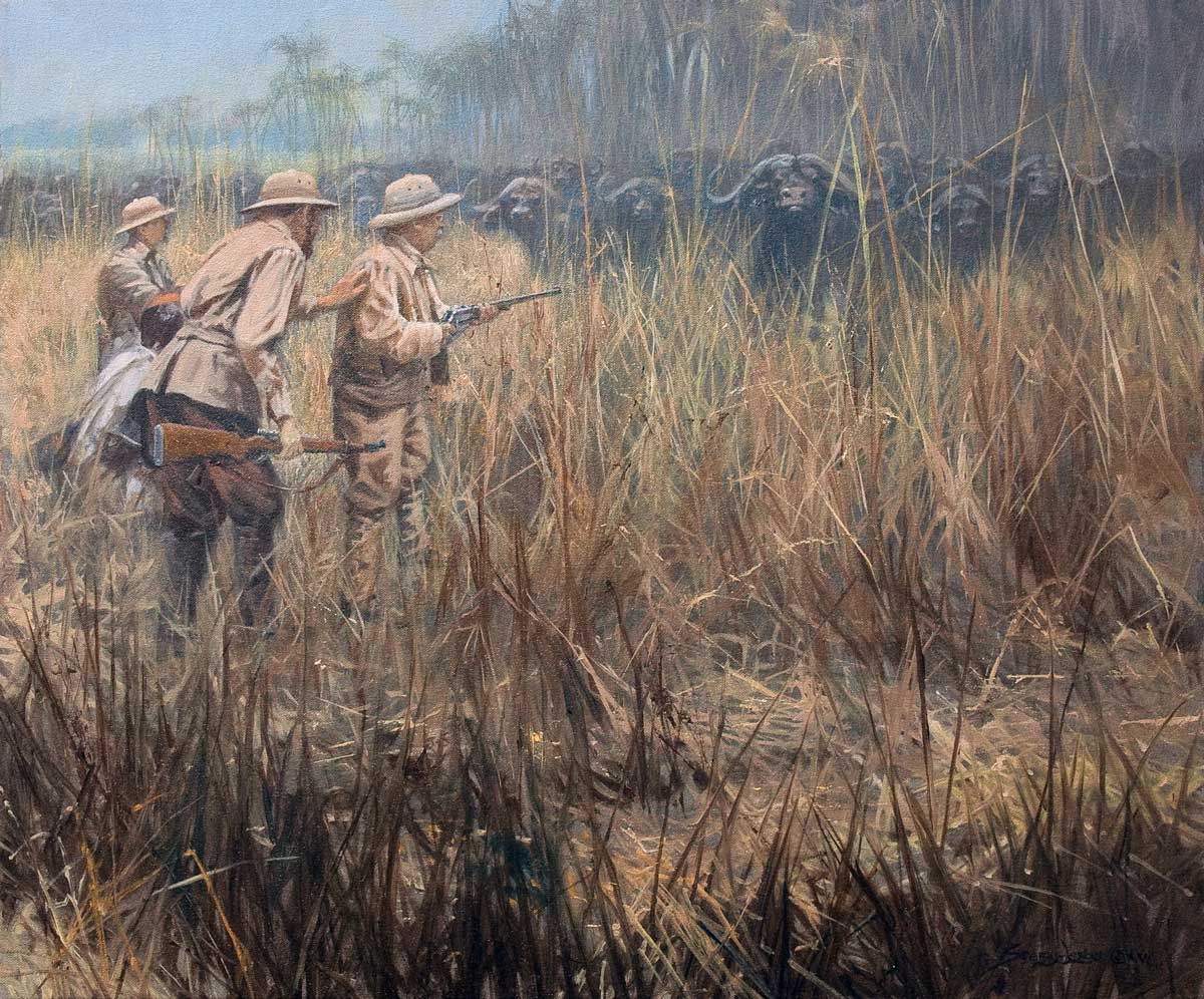 Like many hunters, T.R. found elephant hunting a powerful experience: “The cover was so high that we could not see their tusks, only the tops of their heads…. I fired when [the biggest] was 60 yards away. [Missing the brain, the bullet] brought the elephant to its knees; as it rose I floored it with the second barrel….”