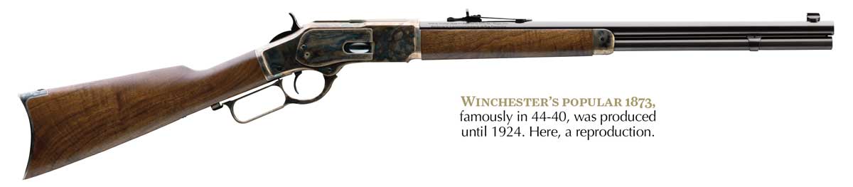 Winchester, meanwhile, had introduced two new rifles. Its Model 1873 was an improved 1866, iron then steel replacing the brass receiver and a carrier cover shielding the action from dust, rain and snow. The 1873 chambered Winchester’s first centerfire round. The 44-40’s 40 grains of blackpowder hurled a 200-grain bullet at 1,200 fps. In 1875 William F. “Buffalo Bill” Cody effused: “… For general hunting or Indian fighting I pronounce your improved Winchester [1873] the boss….” The 1873 was later bored to 38-40 (38 WCF, in 1880) and 32-20 (32 WCF, in 1882). Beginning in 1884, the mechanism was modified to cycle 22 Rimfire ammo. Hailed for its part in settling our West, the ’73 traveled abroad, helping militias mold nations. The last of 720,610 of these rifles shipped in 1924.