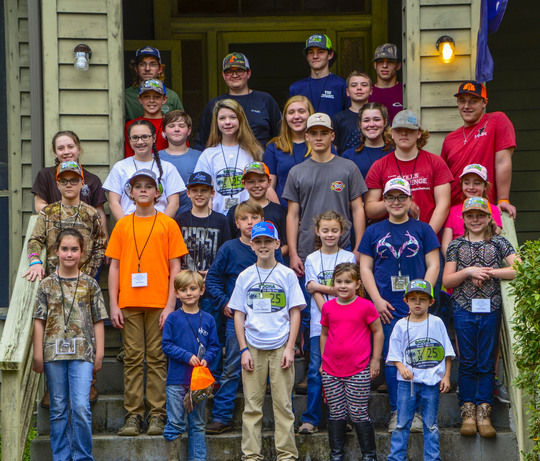 Participants in the 2019 S.C. State Youth Coon Hunt Championship pose for a group photo on the steps of the historic lodge at the SCDNR’s James W. Webb Wildlife Center. [SCDNR photo by D. Lucas]