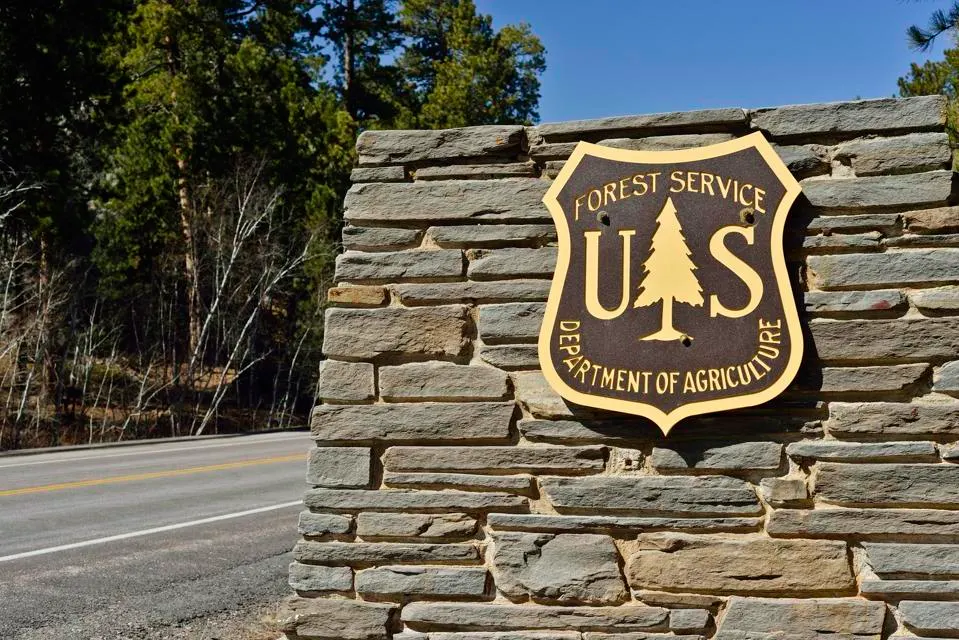 Keystone, South Dakota, USA – April 2, 2013: The emblem of the US Forest Service, part of the Department of Agriculture outside of Keystone, South Dakota.