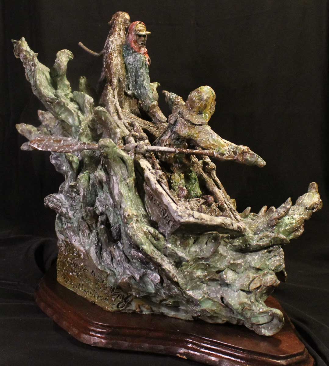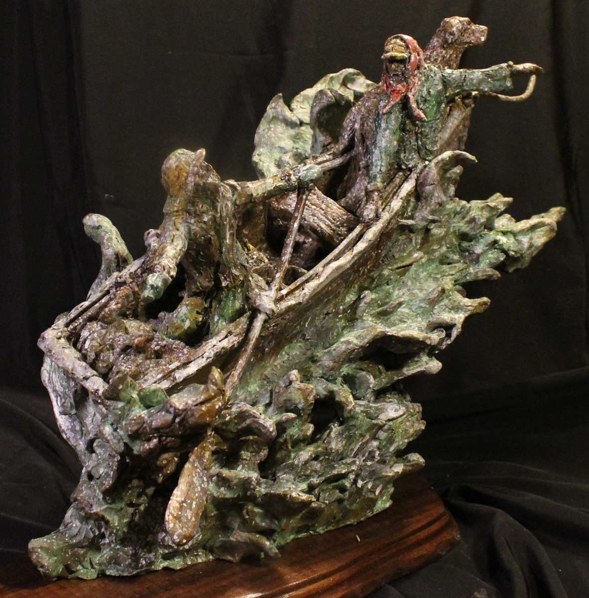 As I sculpted, I did the waves quickly to add energy to the chaos of the scene. Once the basic form materialized, I started seeing images and subliminal shapes; some half-created on purpose, most by pure accident. The profile of Ullr, the Norse God of winter, his screaming head and dragging arms, smash through the whole scene. The wind-whipped broken bow rope represents the tail or tongue of something wicked.